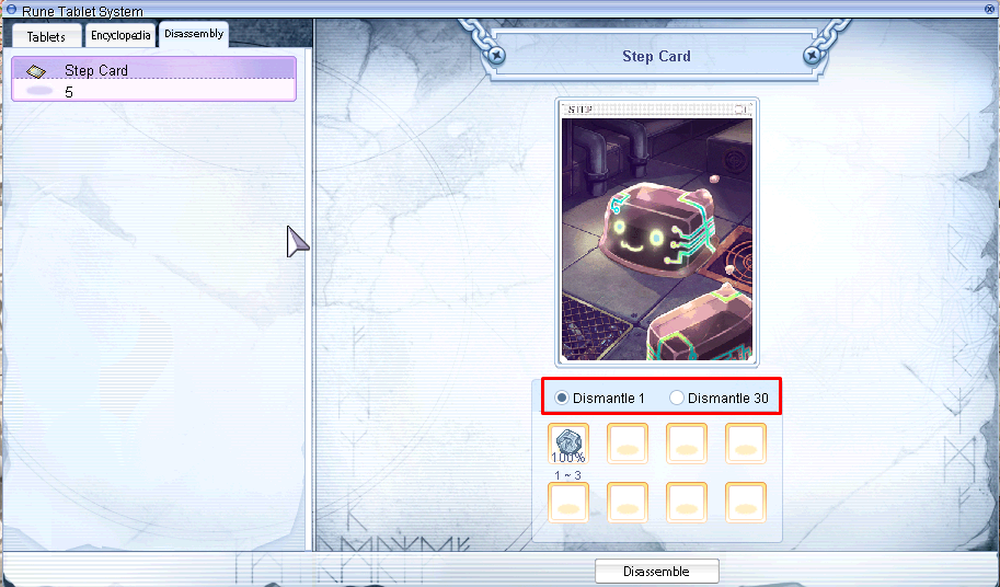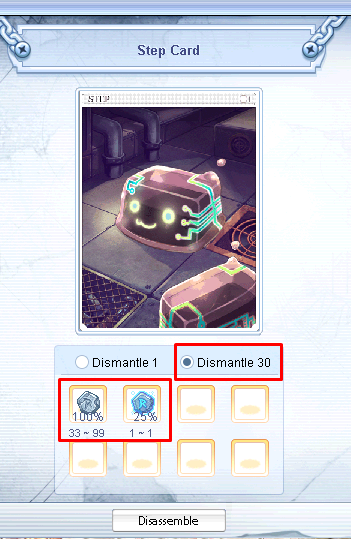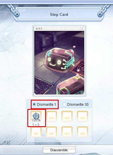 Format:[<Item ID>] = {<Type1>,<Type2>}<Item ID>: ID which can be disassembled<Type1>: would be selected if you dismantle "1"<Type2>: would be selected if you dismantle "30"
