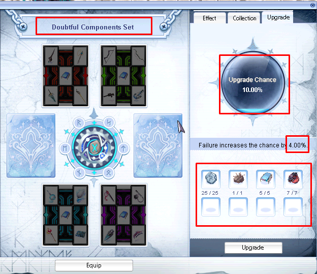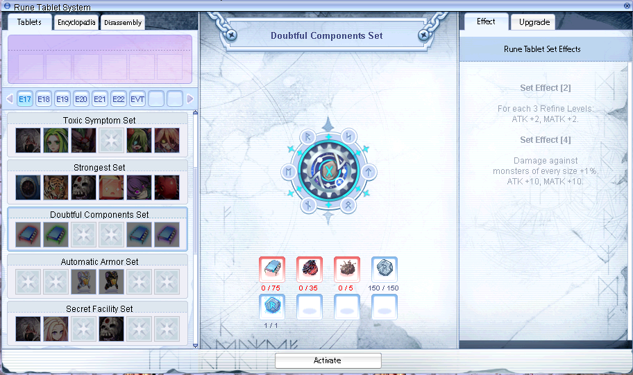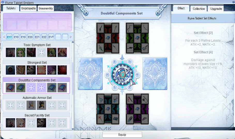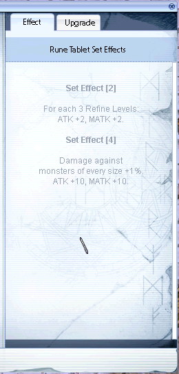 RuneSetRes: Texture file nameRuneSetActiveList: Value refers to item requirements to activate it, located inSystem_table.lubRuneSet_SlotList: Values refers toRUNEIDTBLtable and can have less values than 6, but that screws the slotsRuneSet_UpGradeList: Value refers to item requirements to upgrade (refine) it, located inSystem_table.lubRuneSet_UpGrade_Percentage_tableandRuneSet_UpGrade_Percentage_table_Fail: Both values refer to table index ofGradeTableandGradeTable_Failrespectively, representing the success chance and the increase of the success chance in case the upgrade fails.